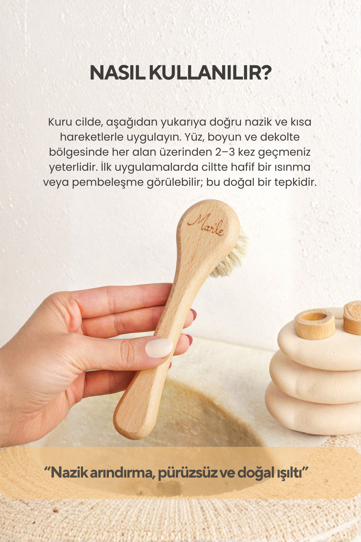 Mar’le %100 Doğal At Kılı Yüz Bakım Fırçası, yüzdeki kan dolaşımını hızlandırmak, cildi ölü hücrelerden arındırmak ve gözenekleri temizlemek için özel olarak tasarlanmış %100 doğal ahşaptan üretilmiş ergonomik saplı bir bakım ürünüdür. Düzenli kullanımda ince çizgi ve kırışıklıkların görünümünü azaltmaya, göz altı şişkinliklerini hafifletmeye ve cilt tonunu eşitlemeye yardımcı olur. Kuru fırçalama tekniği sayesinde ciltte biriken ölü hücreleri nazikçe temizler, fazla yağı ve kiri arındırarak gözeneklerin açılmasını sağlar. Böylece cilt nefes alır, toksinlerden arınır ve daha pürüzsüz bir görünüme kavuşur. Cilt bakım rutininizin ayrılmaz bir parçası olacak Mar’le %100 Doğal At Kılı Yüz Bakım Fırçası, sentetik kıl içermez ve at yelelerindeki kıllardan özenle seçilerek üretilmiştir. Ürün, %100 pamuk ham bez saklama kesesi ile birlikte gönderilmektedir.