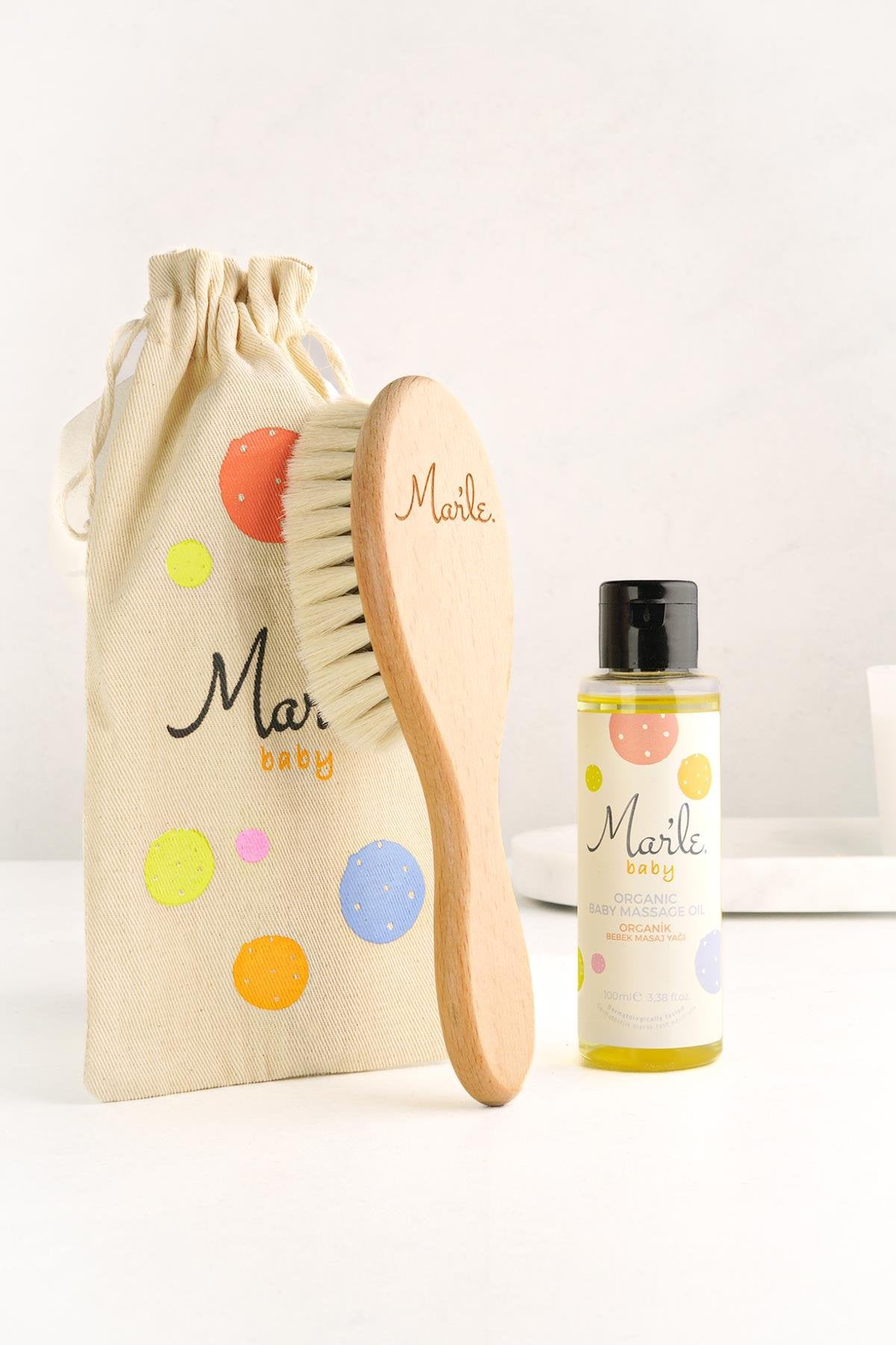 Mar’le %100 Doğal Keçi Kılı Bebek Saç Fırçası & Mar’le Organik Bebek Masaj Yağı Seti