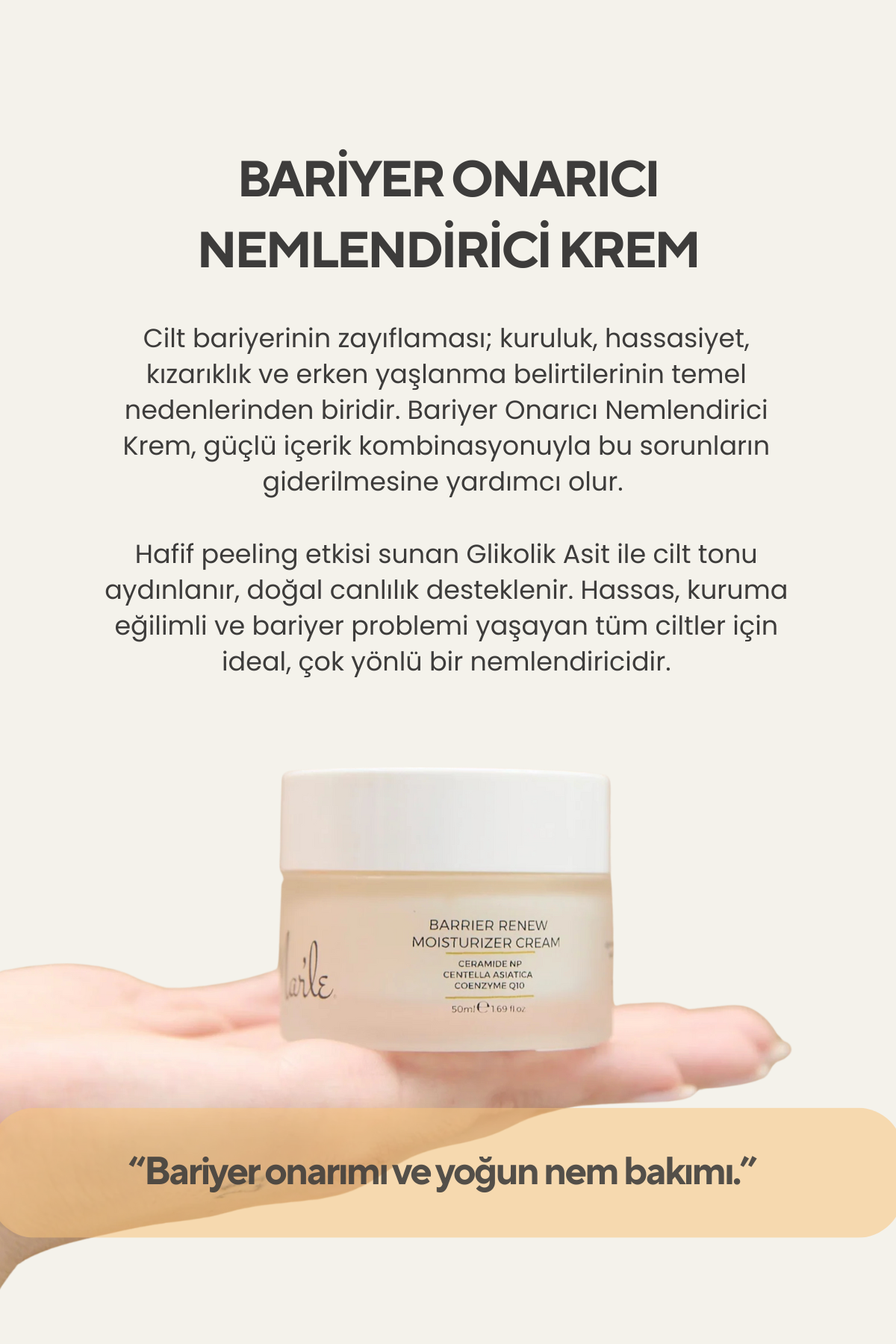 Cilt bariyerinin zayıflaması; kuruluk, hassasiyet, kızarıklık ve erken yaşlanma belirtilerinin temel nedenlerinden biridir. Bariyer Onarıcı Nemlendirici Krem, güçlü içerik kombinasyonuyla bu sorunların giderilmesine yardımcı olur. Seramid ve Centella Asiatica Özü, cilt bariyerini yeniden yapılandırırken tahriş ve kızarıklığı yatıştırır. Beta-Glukan, Hyaluronik Asit ve Panthenol cilde yoğun nem kazandırır, elastikiyetini artırır ve derinlemesine onarır. Üzüm Çekirdeği Yağı, Jojoba Yağı ve Koenzim Q10 gibi antioksidan ve besleyici içerikler sayesinde cilt yaşlanma belirtilerine karşı korunur; daha pürüzsüz ve sağlıklı bir görünüme kavuşur. Hafif peeling etkisi sunan Glikolik Asit ile cilt tonu aydınlanır, doğal canlılık desteklenir. Hassas, kuruma eğilimli ve bariyer problemi yaşayan tüm ciltler için ideal, çok yönlü bir nemlendiricidir.