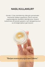 Günde 1–2 kez, temizlenmiş cilde göz çevresinden kaçınarak nazikçe uygulayınız. Serum sonrası uygulandığında, içeriklerin etkinliği artar. Düzenli kullanımda cilt bariyeri güçlenir, nem dengesi korunur ve cilt doğal ışıltısını geri kazanır.